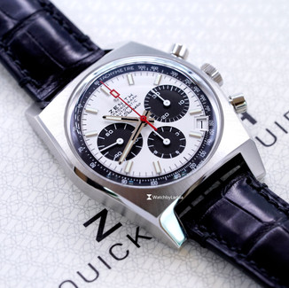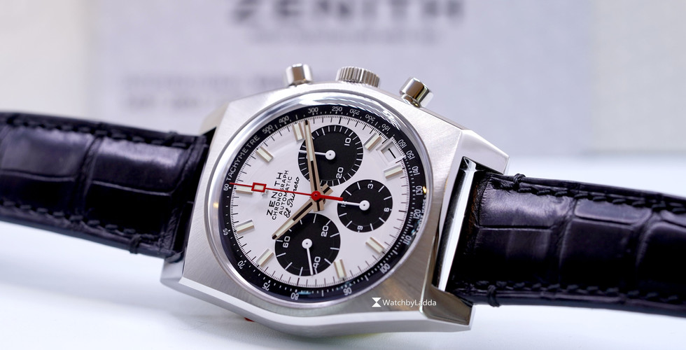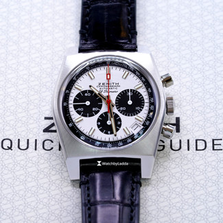 สำหรับเรือนนี้ก็ตรงตามชื่อรุ่นเลยค่ะ โดยเอาต้นแบบของ Zenith A384 ที่บรรจุเครื่อง El Primero ในปี 1969 มาผลิตอีกครั้ง ถอดแบบรูปร่างหน้าตาของ A384 มาเป๊ะ ๆ อย่างตัวเรือนสแตนเลสสตีลทรงเหลี่ยมขนาด 37 มม. ความหนา 12.6 มม. หน้าปัดกลม พื้นหน้าปัดสีขาว วงรีจีสเตอร์สามวงย่อยสีดำ ที่เรียกว่า “หน้าแพนด้า” ไม่มีขอบ Bezel ตัดขอบหน้าปัดหลักด้วยแถบสีดำมีสเกล Tachymetre จับความเร็ว คำว่า “El Primero” ใช้ฟอนต์ตัวเขียนเหมือนรุ่นดั้งเดิมช่องวันที่ตรงตำแหน่งระหว่าง 4 และ 5 นาฬิกา เข็มและหลักเวลามีพรายน้ำ Super-Luminova เข็มโครโนกราฟสีแดง